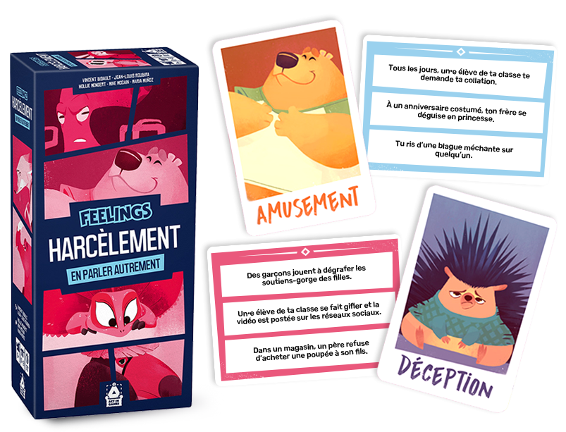 Feelings Harcèlement est un outil ludopédagogique qui invite à parler autrement de l’harcèlement et de thématiques liées à la vie des jeunes. il invite à exprimer ses émotions face à des situations, puis ouvre au dialogue et à l’empathie en invitant à de deviner ce qu’ont ressenti les autres joueurs.